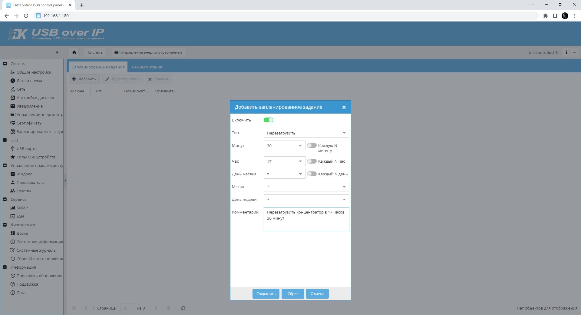 В разделе «Запланированные задания» создаеются задания на управление (включить/выключить) USB портами управляемого USB over IP концентратора DistKontrolUSB 3.0. На странице разделе «Запланированные задания» необхожимо нажать кнопку "Добавить" и заполнить всплывающее окно: